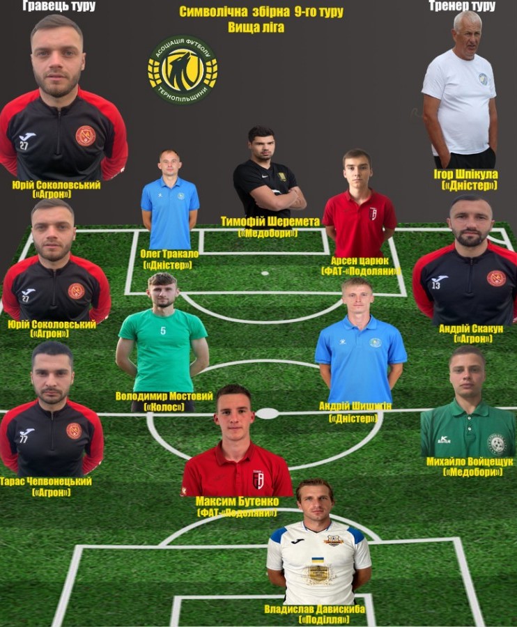Пропонуємо до Вашої уваги символічну збірну дев'ятого туру вищої ліги чемпіонату Тернопільської області 2023 року за версією Асоціації футболу Тернопільщини.