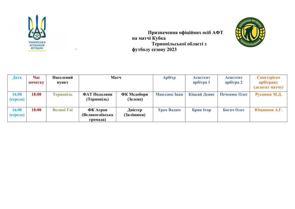 ПРИЗНАЧЕННЯ ОФІЦІЙНИХ ОСІБ АФТ НА КУБКОВІ МАТЧІ 16 СЕРПНЯ