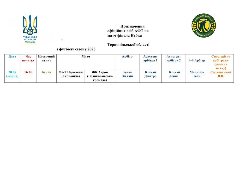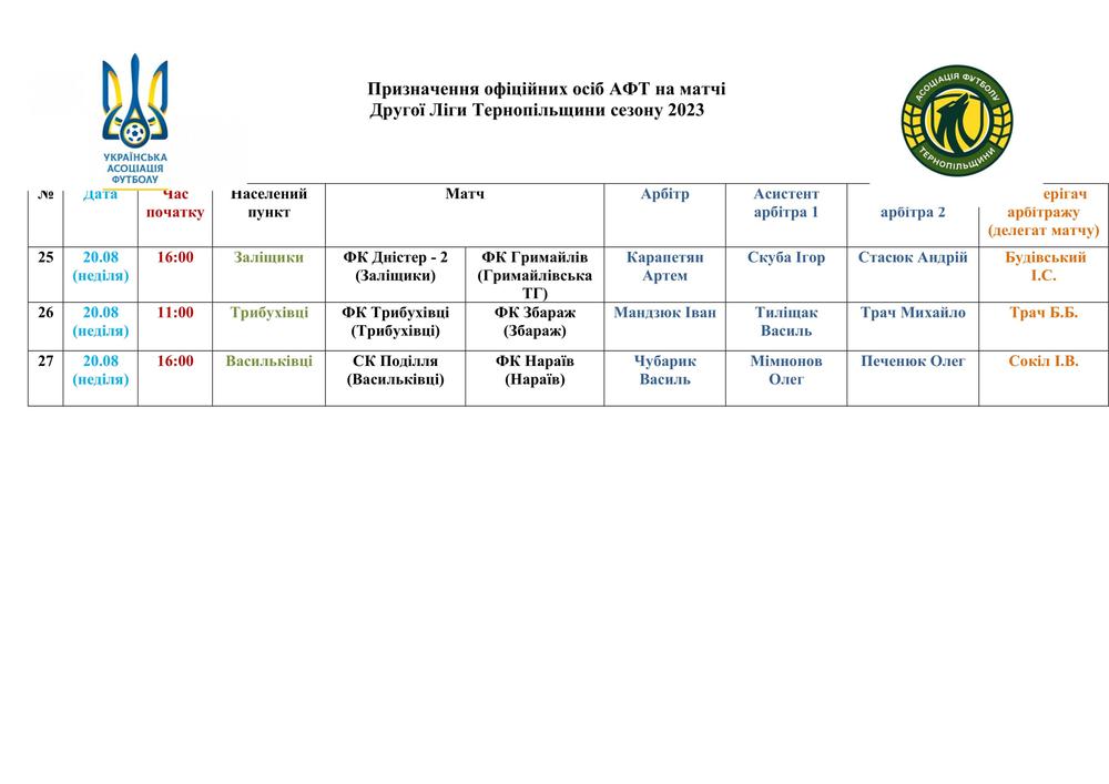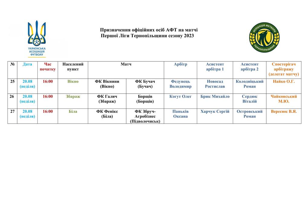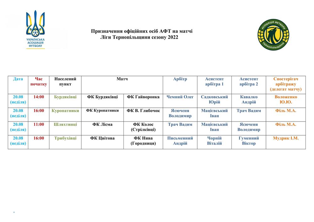 ПРИЗНАЧЕННЯ ОФІЦІЙНИХ ОСІБ АФТ НА МАТЧІ 20 СЕРПНЯ