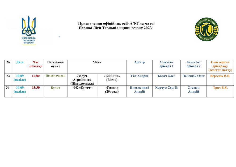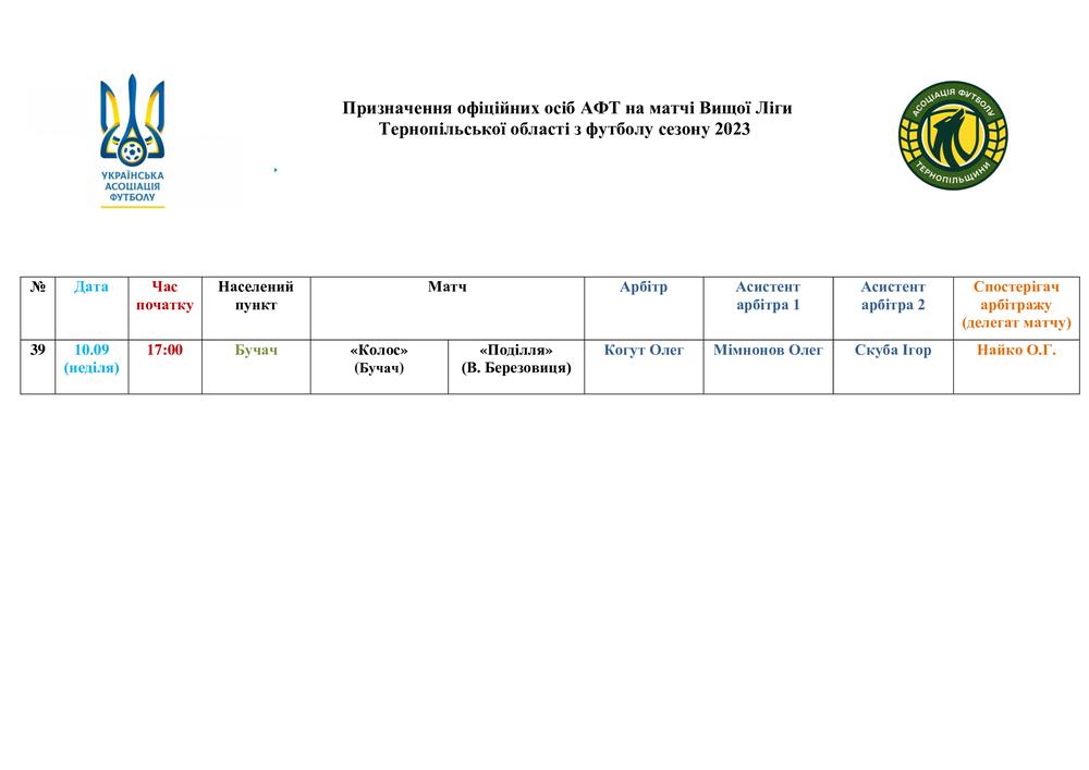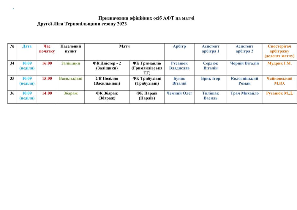 Призначення офіційних осіб АФТ на матчі чемпіонату області. 10 вересня