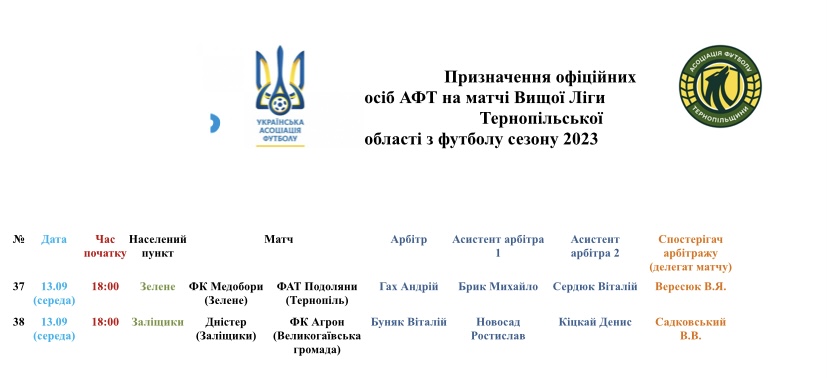 ПРИЗНАЧЕННЯ ОФІЦІЙНИХ ОСІБ АФТ НА МАТЧІ 13 ВЕРЕСНЯ
