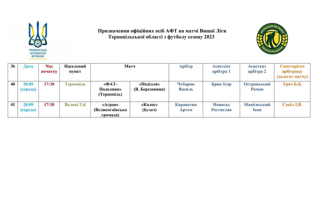 ПРИЗНАЧЕННЯ ОФІЦІЙНИХ ОСІБ АФТ НА МАТЧІ 20 ВЕРЕСНЯ