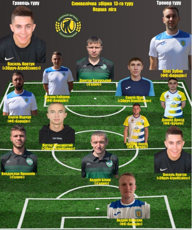 Пропонуємо до Вашої уваги символічну збірну тринадцятого туру першої ліги чемпіонату Тернопільської області 2023 року за версією Асоціації футболу Тернопільщини.