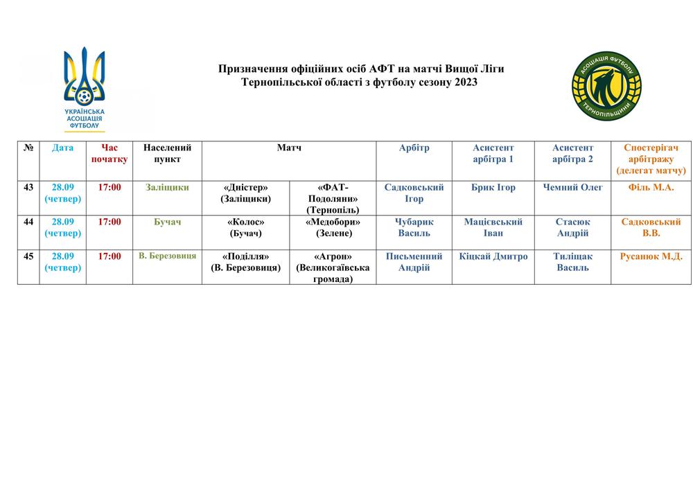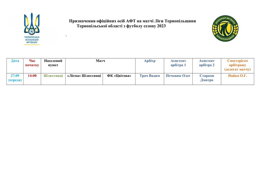 ПРИЗНАЧЕННЯ ОФІЦІЙНИХ ОСІБ АФТ НА МАТЧІ 27-28 ВЕРЕСНЯ