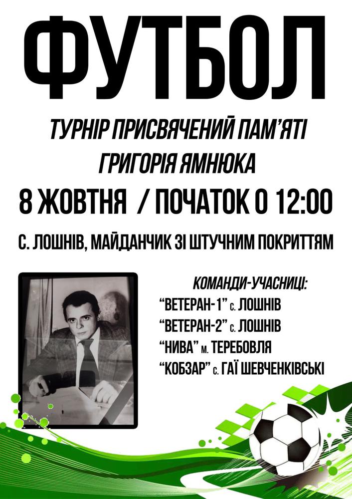 Асоціація футболу Тернопільщини та комітет ветеранського футболу області у неділю, 8 жовтня, у селі Лошнів (Теребовлянщина) організовують турнір з міні-футболу серед ветеранів присвячений пам’яті місцевого тренера та спортивного інструктора міцевого господарства Григорія Ямнюка.