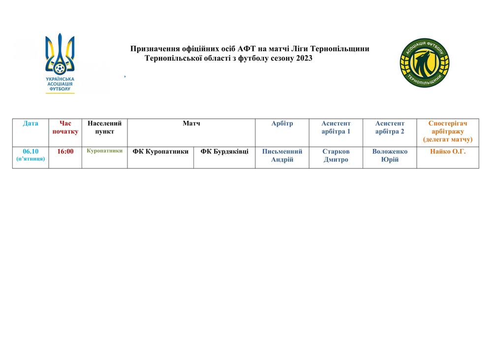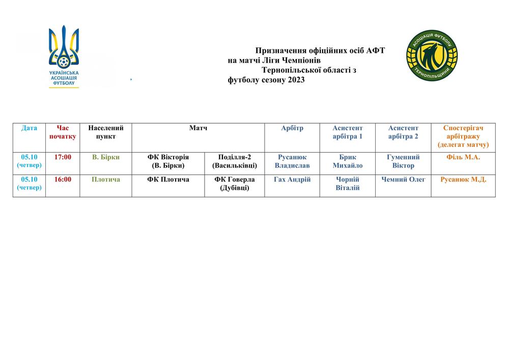 Призначення офіційних осіб АФТ на матчі Ліги чемпіонів та Ліги Тернопільщини. 4-5 жовтня
