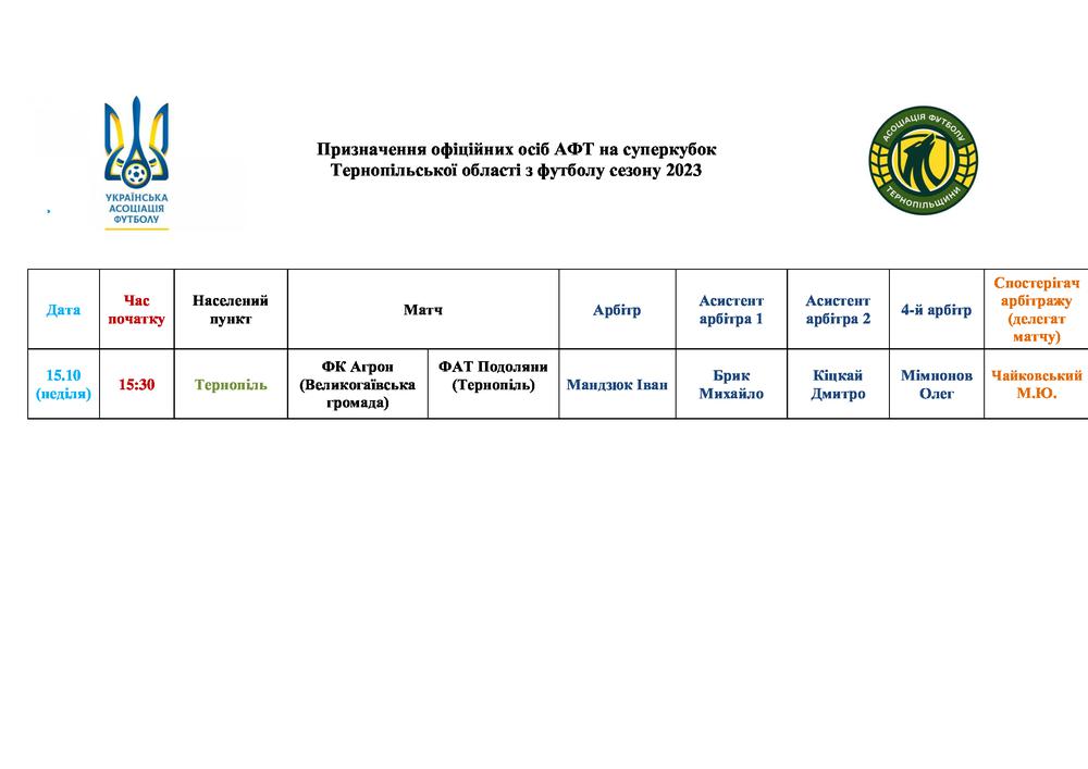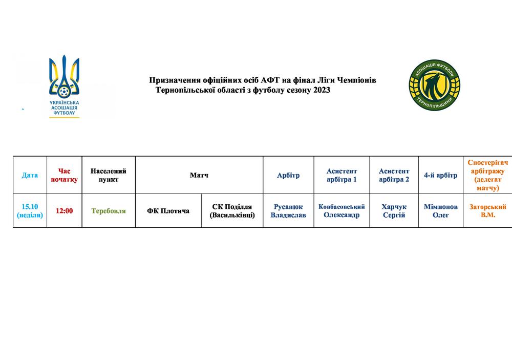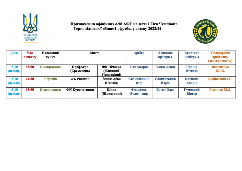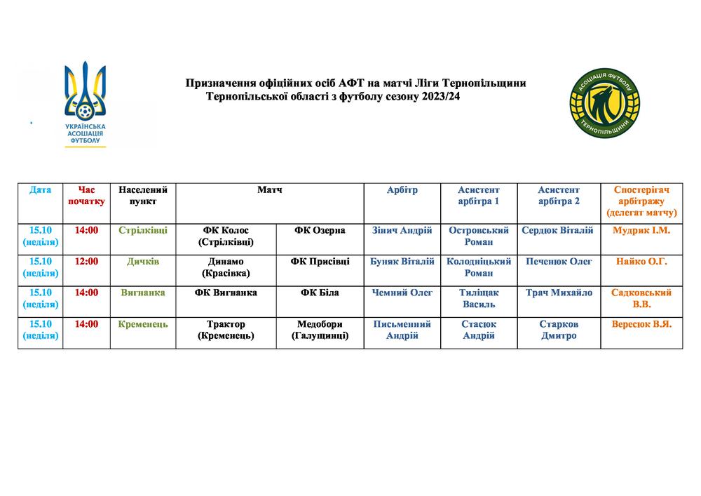 ПРИЗНАЧЕННЯ ОФІЦІЙНИХ ОСІБ АФТ НА МАТЧІ 15 ЖОВТНЯ