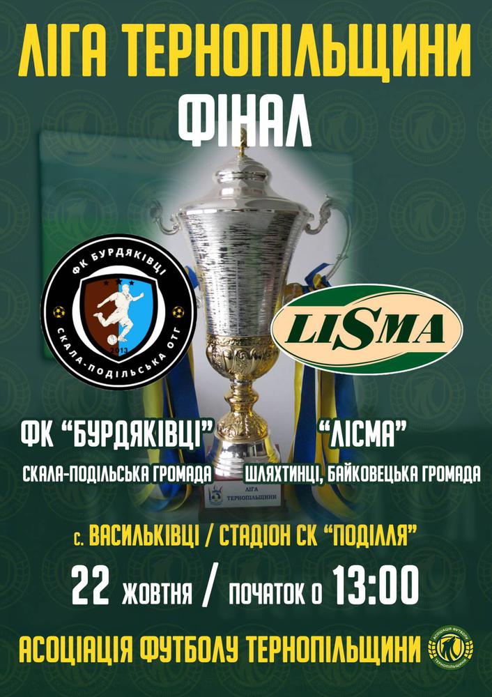 Афіша фінального поєдинку Ліги Тернопільщини сезону-2022/23: ФК "Бурдяківці" – "Лісма" (Шляхтинці)