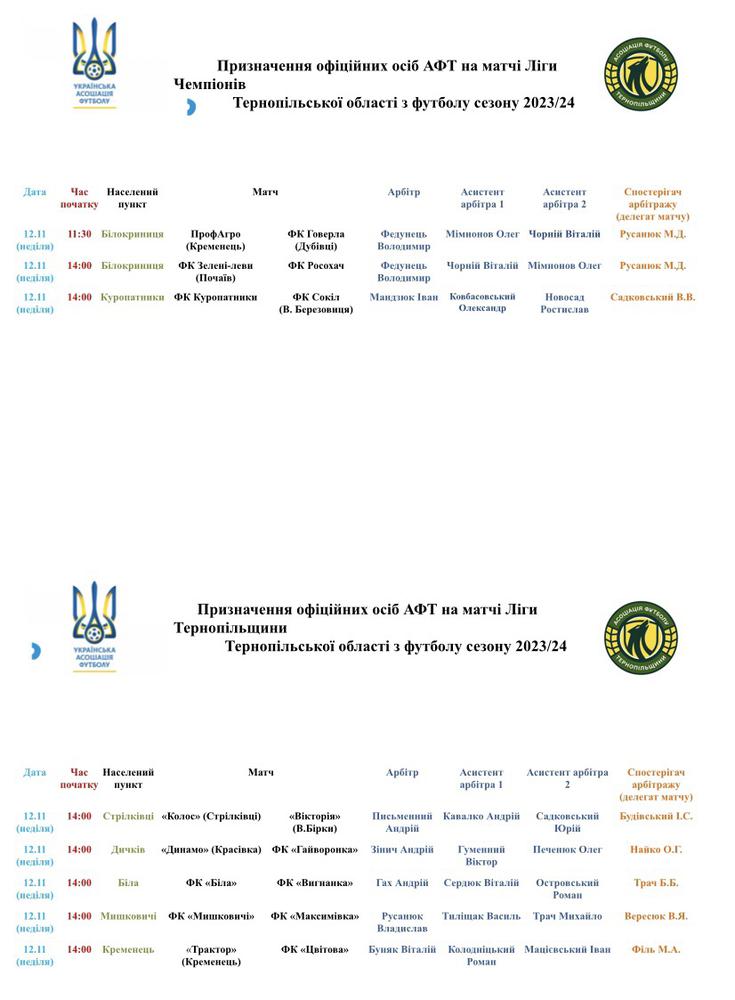 ПРИЗНАЧЕННЯ ОФІЦІЙНИХ ОСІБ АФТ НА МАТЧІ 12 ЛИСТОПАДА