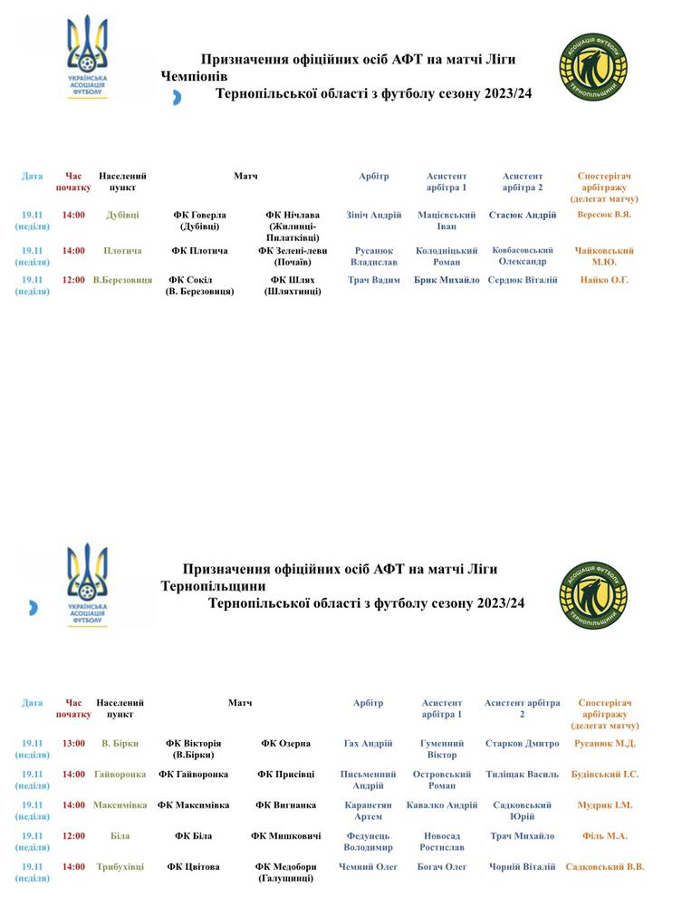 ПРИЗНАЧЕННЯ ОФІЦІЙНИХ ОСІБ АФТ НА МАТЧІ 19 ЛИСТОПАДА