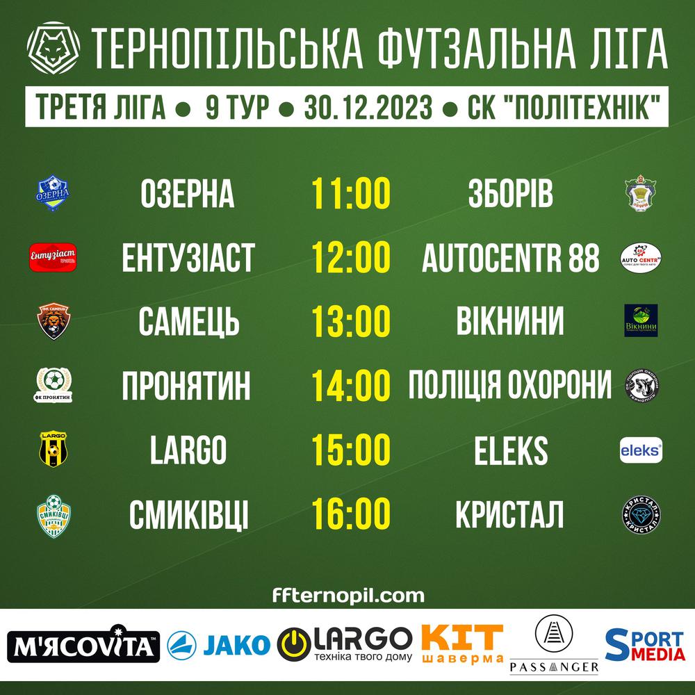 30 грудня у СК «Політехнік» відбудеться шість матчів 9-го туру Тернопільської обласної футзальної ліги сезону-2023/24.