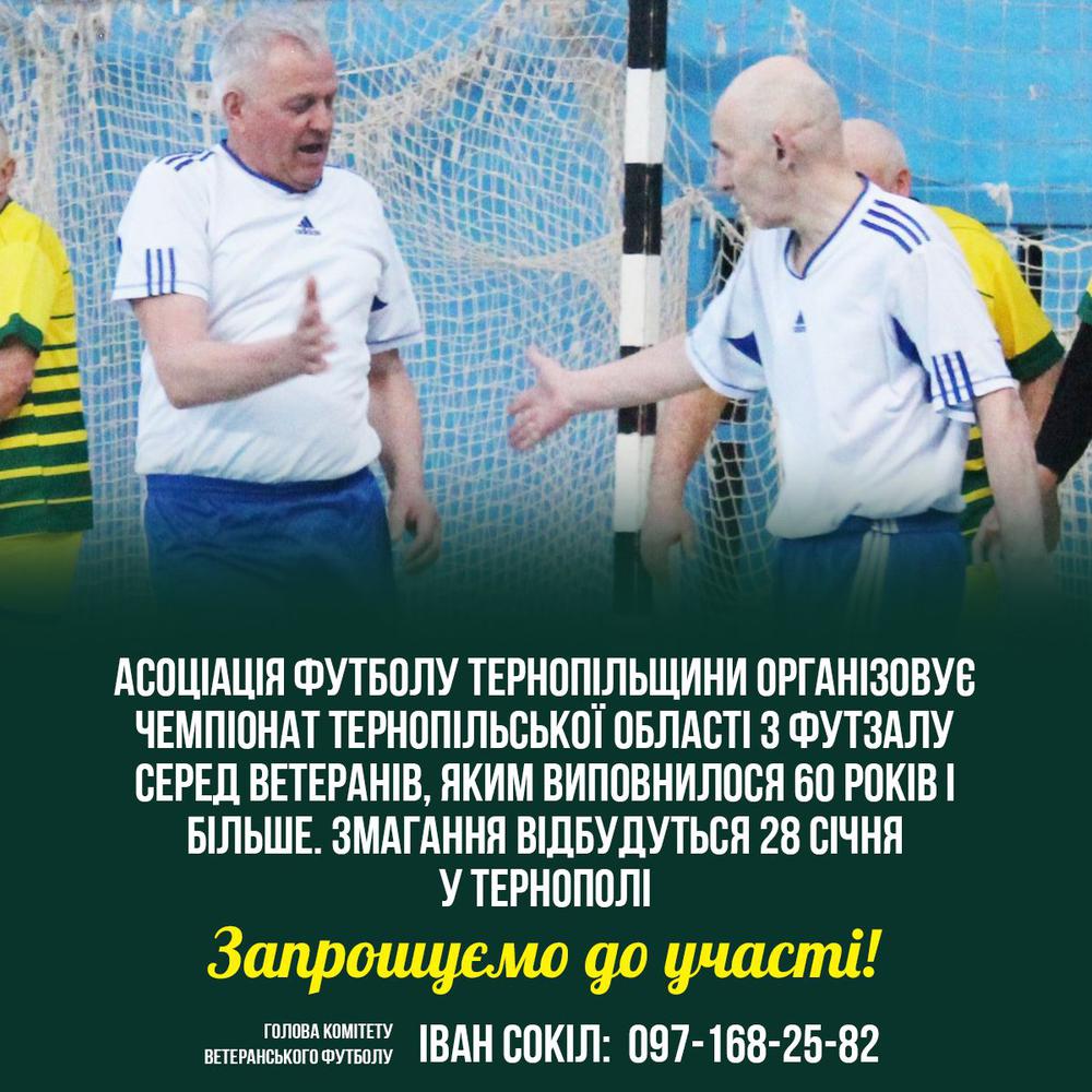 Водночас, Асоціація футболу Тернопільщини приймає заявки на участь у чемпіонаті Тернопільської області з футзалу серед ветеранів наступної вікового категорії, а саме, для ветеранів, яким виповнилося 60 років і більше. Змагання відбудуться у неділю, 28 січня.