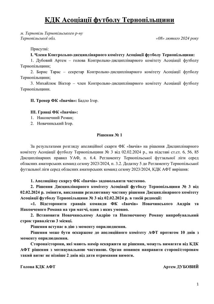 РІШЕННЯ КДК АСОЦІАЦІЇ ФУТБОЛУ ТЕРНОПІЛЬЩИНИ №1/2024
