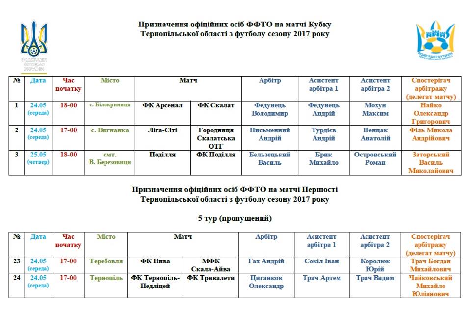Призначення офіційних осіб ФФТО на матчі кубка та першої ліги на 24-25 травня