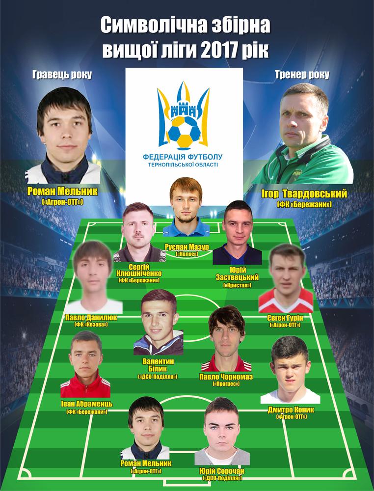 2017-12-20 13:00:46.000000Пропонуємо до Вашої уваги символічну збірну 2017 року за результатами чемпіонату Тернопільської області в вищій лізі.