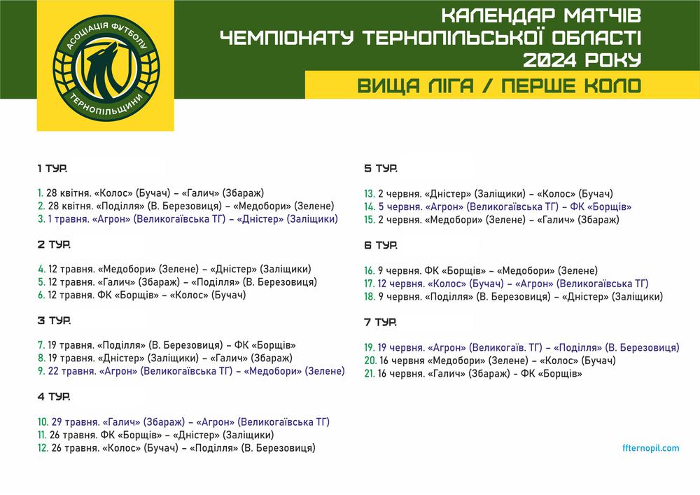 КАЛЕНДАР МАТЧІВ ЧЕМПІОНАТУ ТЕРНОПІЛЬСЬКОЇ ОБЛАСТІ 2024 РОКУ. ВИЩА ЛІГА. ПЕРШЕ КОЛО
